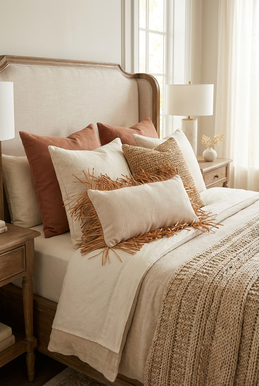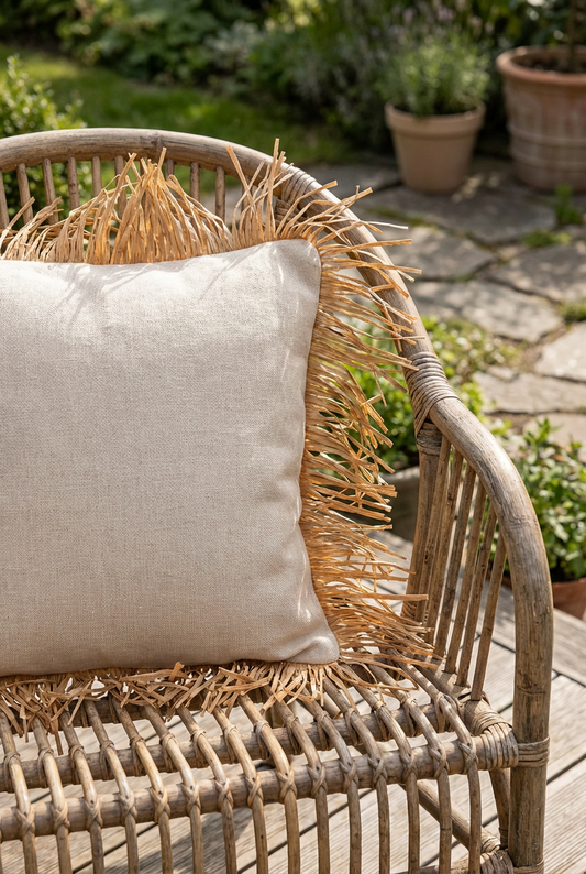 Bohem Rafya Püsküllü Doğal Kumaş Kırlent Kılıfı Bej 45x45 cm