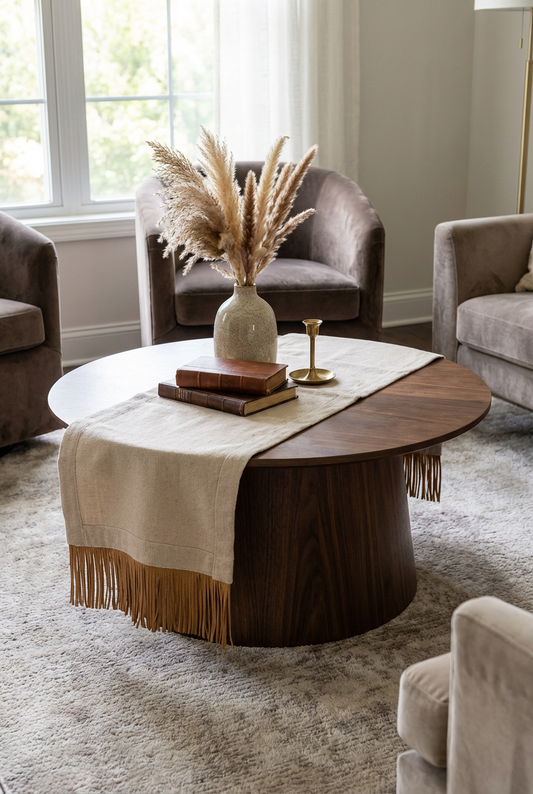 Bohem Rafya Püsküllü Doğal Kumaş Runner Bej 30x100 cm
