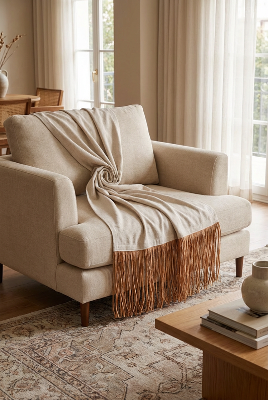 Bohem Rafya Püsküllü Doğal Kumaş Yatak-Koltuk Şalı 80x160 cm