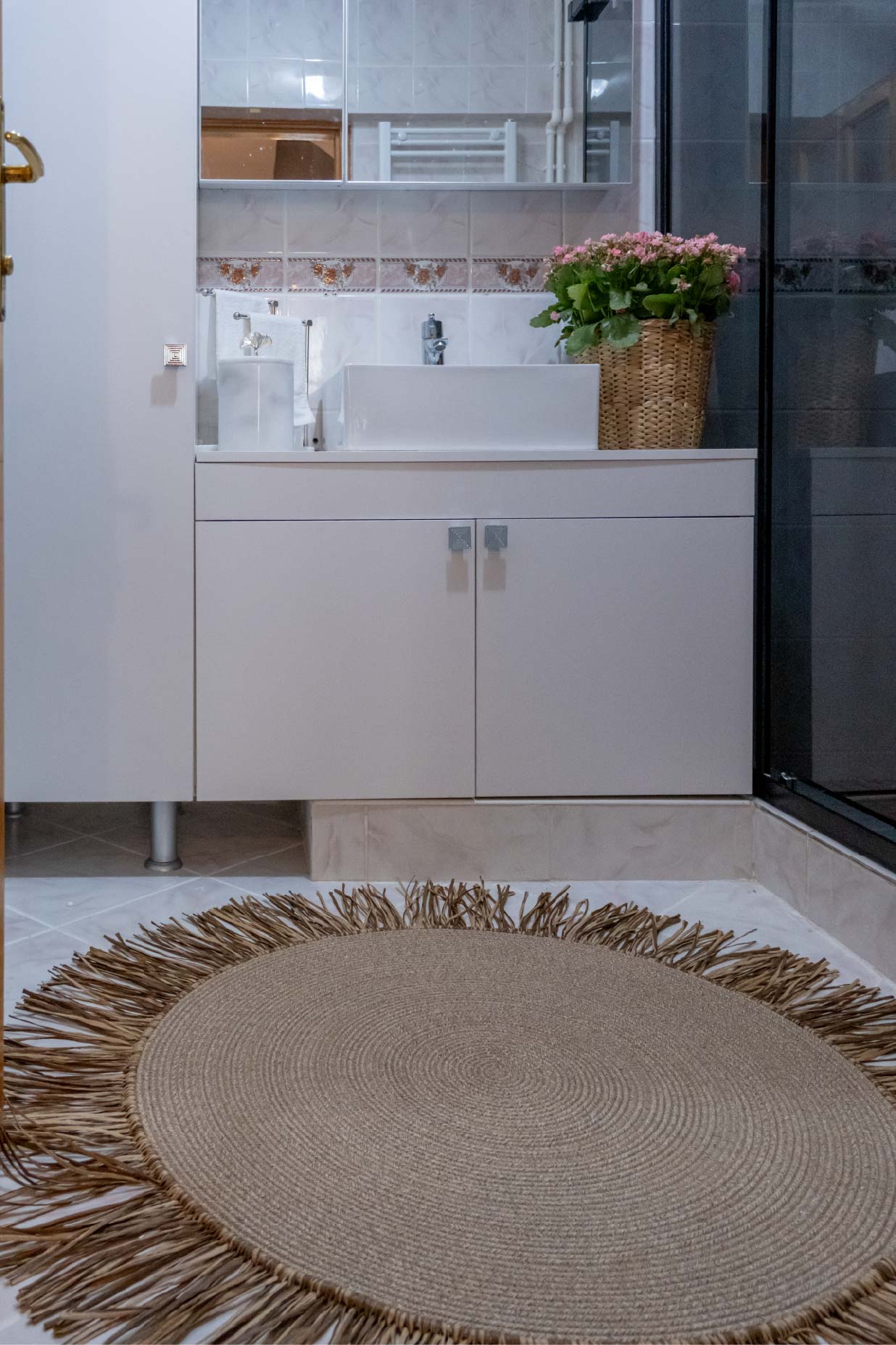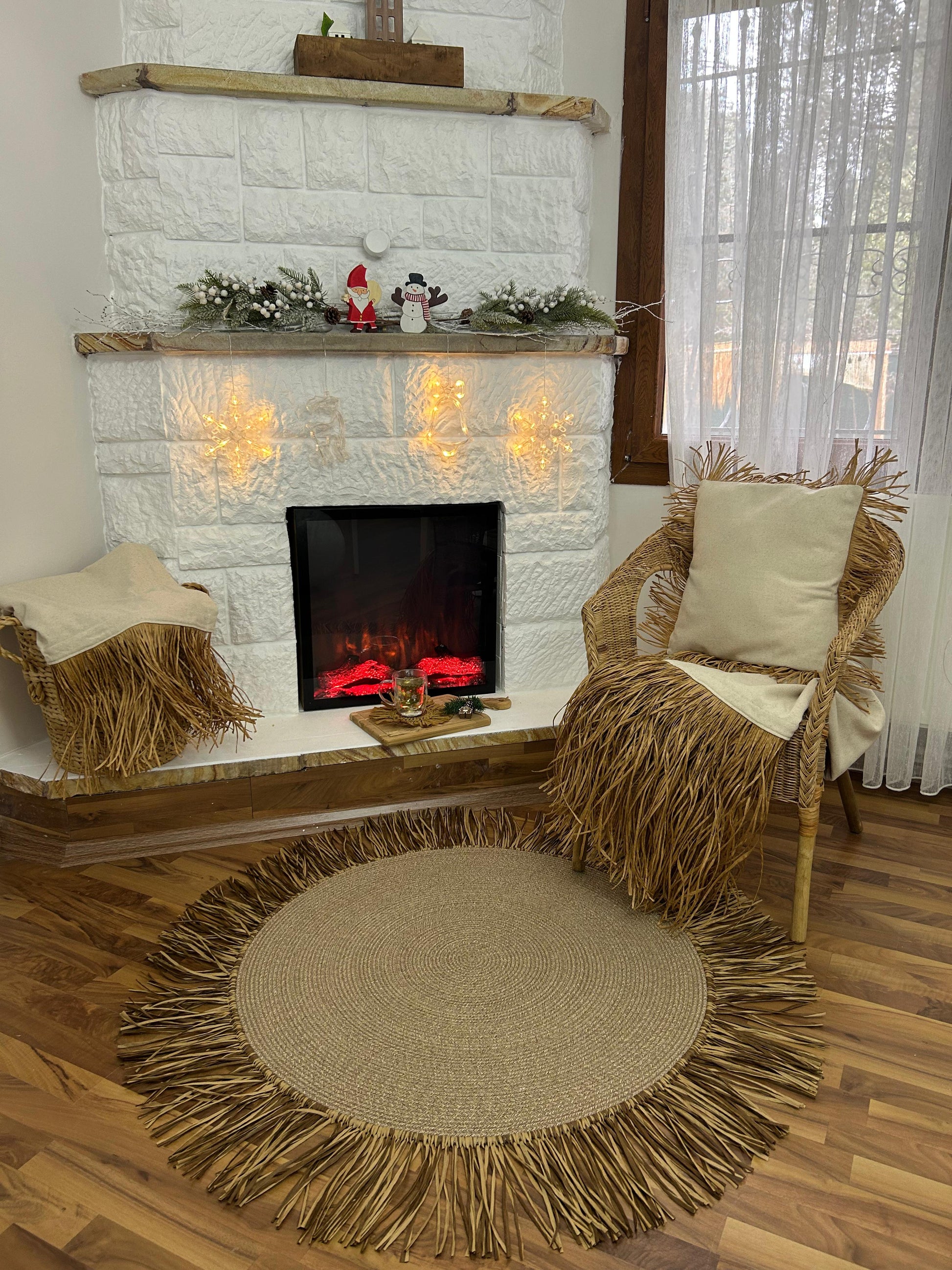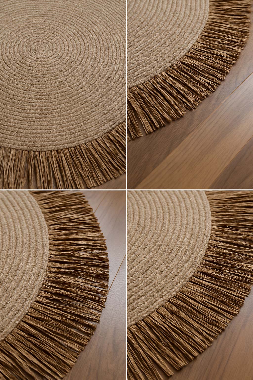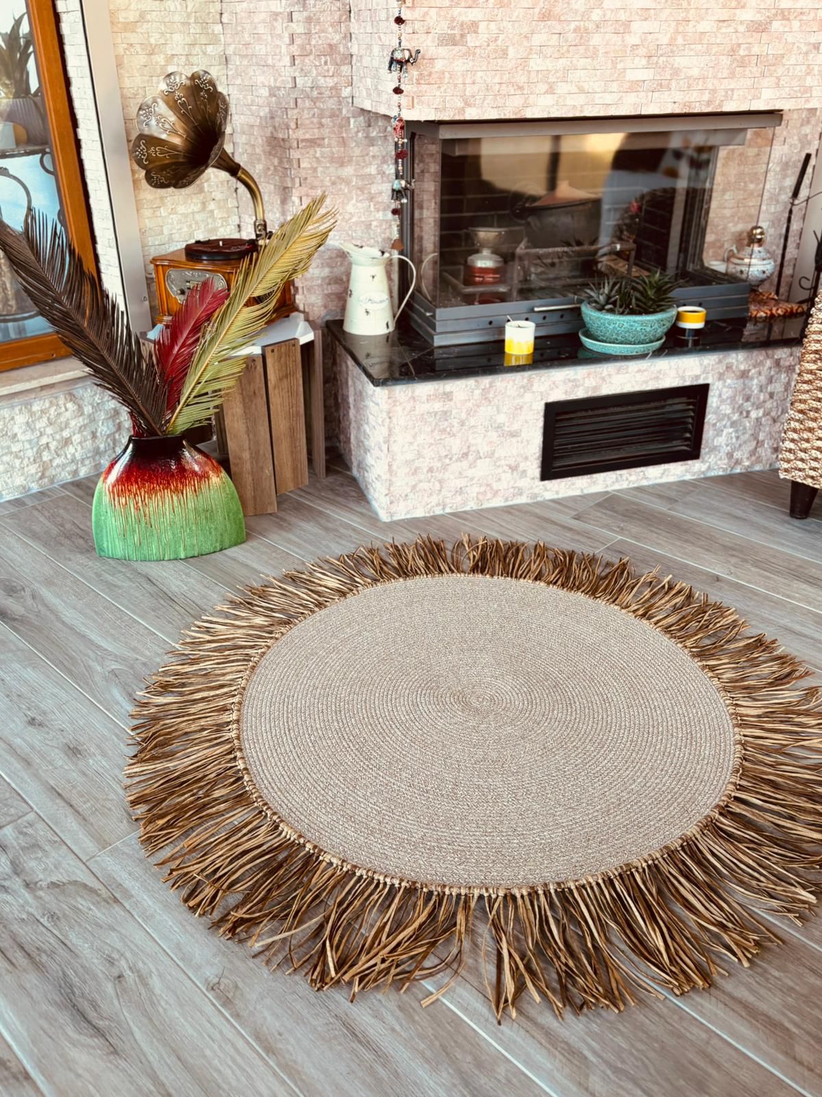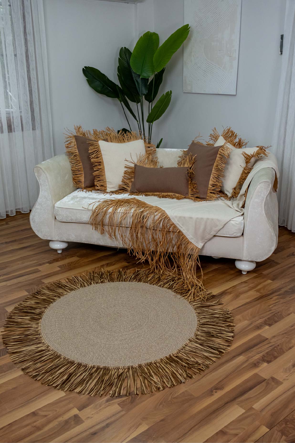 Bohem Rafya Püsküllü El Yapımı Jüt Paspas Halı Krem 90cm